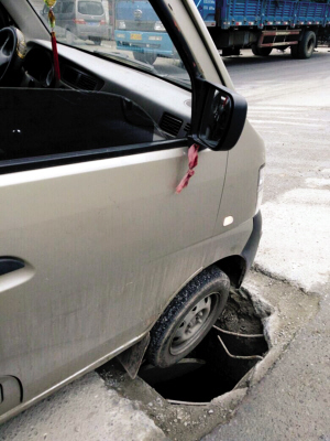 刘女士家住北碚同兴,在井口工业园区上班,同兴南路五星加油站前方的红绿灯是她每天上班的必经之路。26号早晨,刘女士开着长安面包车上班,没想到行至红绿灯处,面包车的右前轮整个陷进路中间坏掉的窨井盖形成的大坑里。