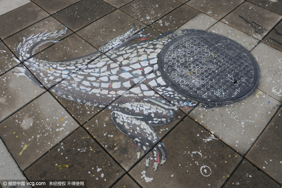 1月7日,在济南山东工艺美术学院长清校区校园内,大学生手画近百个井盖,吸引众多路人眼球,惟妙惟肖的“井盖画”成为一道别样的校园风景。图为鳄鱼漫画。